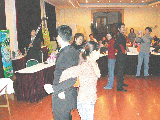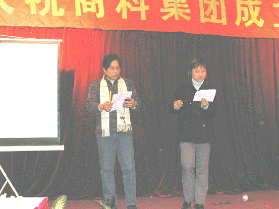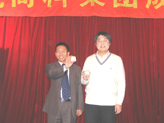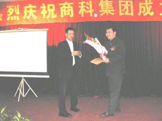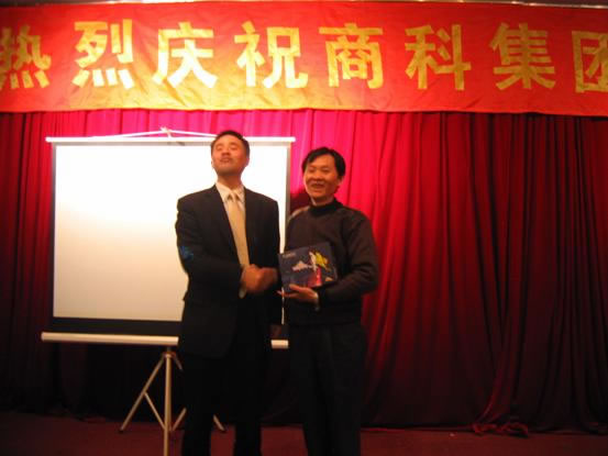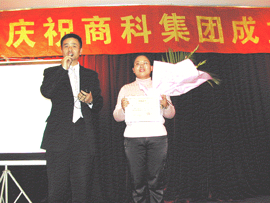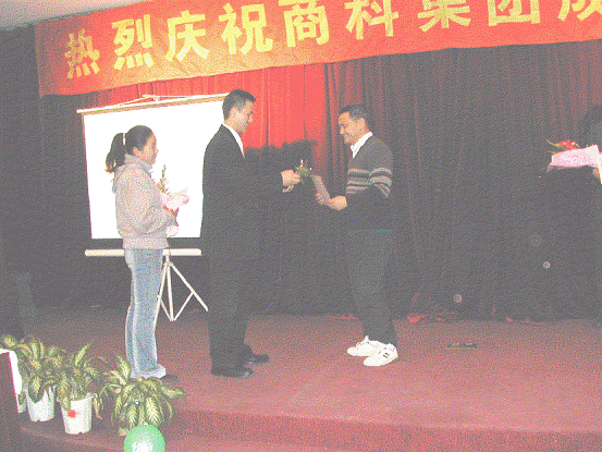 上海分公司員工呂家起正在接受孫經理頒發的“銷售標兵”這個榮譽稱號