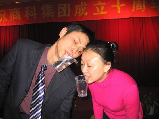 《細水長流》5人/組*2組:每人嘴上含一只杯子,第一人杯中倒滿水,依次將杯中的水倒入下一人杯中,不許用手腳,最快并杯中水最多者為勝