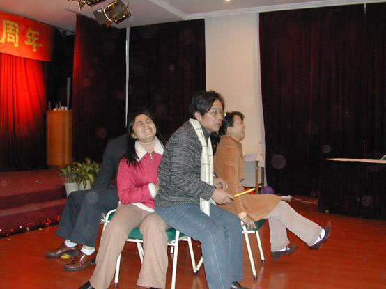 《踩氣球》2人/組*4組:每人左右腳上各綁四個氣球,互相踩對手的氣球,最后以破得最少者為勝。對手們是虎視眈眈,瞄準目標就上。