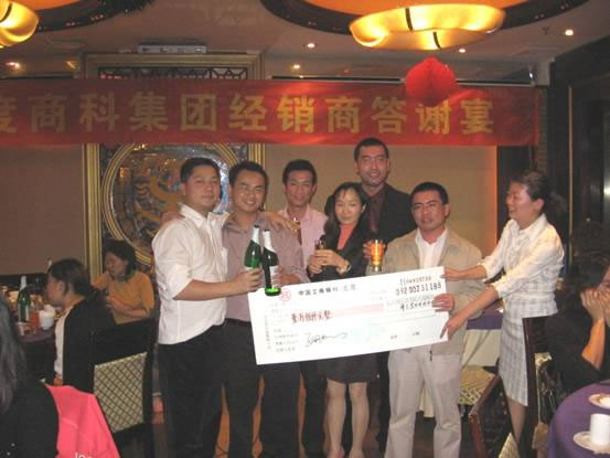 2006年1月17日,商科集團(tuán)廣州分公司與100多位經(jīng)銷商濟(jì)濟(jì)一堂,舉行了經(jīng)銷商答謝宴,感謝過(guò)去一年各位經(jīng)銷商對(duì)商科集團(tuán)的支持,當(dāng)晚還頒發(fā)了“年度個(gè)人貢獻(xiàn)獎(jiǎng)”,“年度公司貢獻(xiàn)獎(jiǎng)”,“年度優(yōu)秀代理商獎(jiǎng)”,獎(jiǎng)品和獎(jiǎng)金豐厚,氣氛熱烈,讓我們一起看看當(dāng)晚的盛況。