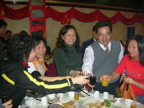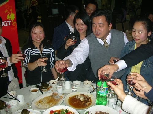 進入晚宴總部劉總與深圳公司余經理向客戶敬酒
