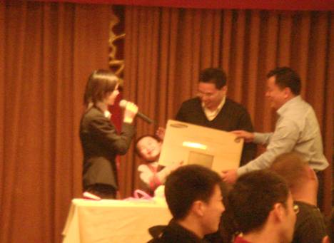 當然不只有蛋糕,禮物早準備好了,由副總經理劉險峰先生為陳總送上賀禮,19寸液晶顯示器一臺。