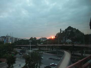 經(jīng)過(guò)整整九個(gè)多小時(shí)的長(zhǎng)途跋涉,下午六點(diǎn)多,終于即將到達(dá)我們的第一站,在進(jìn)入市區(qū)的時(shí)候恰巧夕陽(yáng)西下,一輪紅日慢慢隱沒(méi)與橋的那一頭,又一副壯美景觀呈現(xiàn)于眼前。。