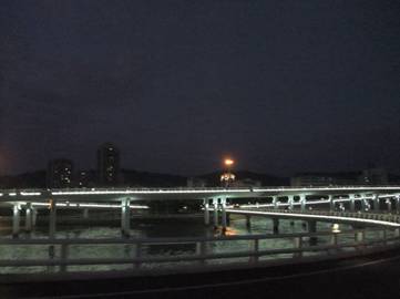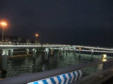 當(dāng)旅行巴士進(jìn)入市區(qū)行至環(huán)島路西段時(shí),一座壯美獨(dú)特的大橋又躍然于眼前。此時(shí),正值華燈初上,遠(yuǎn)遠(yuǎn)看去只見一長(zhǎng)排橋墩呈橢圓型立于水中,空中橋身則為流暢的弧線形,橋上燈火輝煌,橋下波光蕩漾,就如同一條騰出水面的白龍,強(qiáng)烈地震撼著我們的視覺,原來(lái)這就是著名的“演武大橋”。