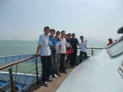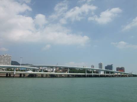 金門島游輪合影 次日,乘坐游輪環(huán)游小金門島再次經(jīng)過(guò)演武大橋,立于船頭遙望廈門市區(qū),只見大橋迎面聳立海上,與夜景絕然不同,她與岸同高, 呈S形的路段環(huán)繞著廈門大學(xué)的海景房,流線型的梁體緩緩延伸,波浪似地起伏著;遠(yuǎn)遠(yuǎn)看去,如長(zhǎng)龍臥波,欲騰空而起,細(xì)看時(shí) 又似展翅飛翔的白鷺,躍出水面的白鰭豚,簡(jiǎn)捷流暢的線條,精美靈動(dòng)的造型,給人以強(qiáng)烈的視覺美感。
