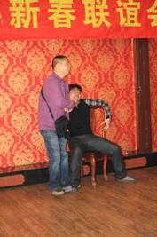 在玩搶凳子的游戲時,上演了兩位產(chǎn)品經(jīng)理的精彩對決,十位選手參加,最后剩下的是銘瑄主板經(jīng)理周紅光和梅捷主板經(jīng)理李小剛,兩位經(jīng)理你搶我奪,最后周經(jīng)理用事實說明了一切,并用表情告訴我們,今年是我的,明年給你坐!看來,我們2011年的主板銷售一定會很好,從他們搶凳子的這種精神里知道了!