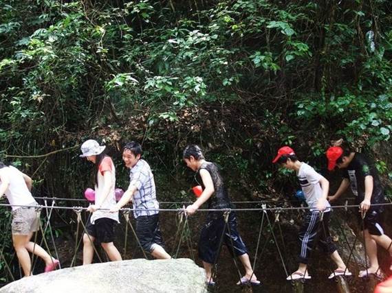 走進銀盞谷,第一節目就是森林溯溪探險,從山腳一路溯溪而上,走獨木橋穿鐵索沿水流彎彎曲曲到達山頂,可能急著去漂流一路上走馬觀花然后沿山路而返,進行今天最重要的節目------黃龍峽漂流!!