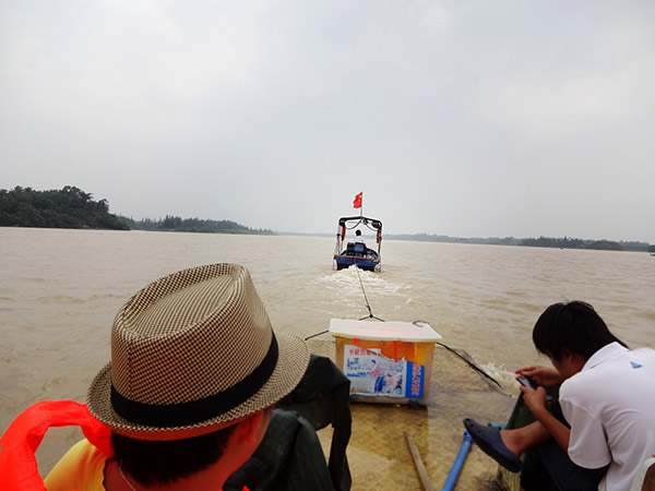 本來是“竹筏漂流”的,但我們是被一艘沒有半點情趣的小火輪拖著走的,古時候有“游街”,我們就叫“游江”吧!