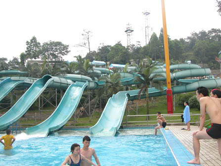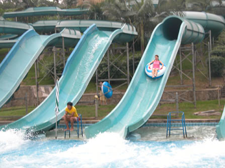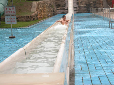 據不可靠的資料記載,此滑水道有七層樓那么高,也就是大概在25米左右,最高出和接地處據本人不完全的統計是成110度角,當你站到最頂點的高臺上的時候,要往下滑的的時候需具有大智大勇的氣魄; 大智,站在上面的時候,千萬的不要往下看看有多高,不然就肯定把你滑下去的決心減低到百分零點幾。(呵呵,說得有點夸張了,別給我嚇到),大勇,其實就是懵懵懂懂的沖下去,根本就不知道自己干了些什么之類的。