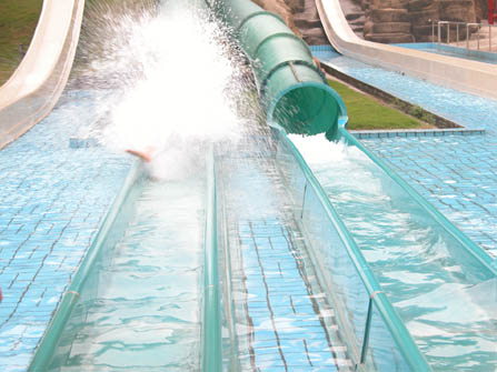這個項目高是20米,長大概是在70米,從上到下平均分為幾個階梯,玩的時候是人趴在一張造型像滑雪車的泡末板上面向下沖,趴在上面向下沖的時候,會感覺自己像在一條告訴管道上滑行的車,或者是像電視里那個超人一樣,平著身體在空中急速飛翔的感覺,非常的好玩,但唯一個不好的地方就是在急速下沖的時候要注意自己的手肘,因為不注意的話會摩擦到滑道的邊而脫皮,本人就是在這個項目中太過興奮,玩了兩次后,才發現自己的一塊皮不見了。:)