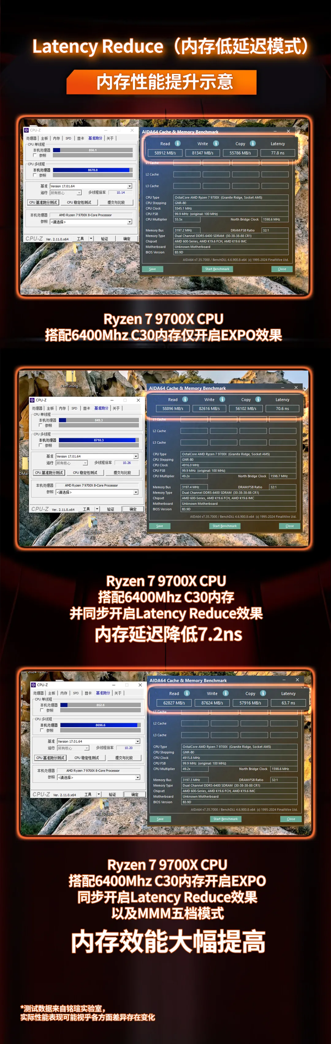針對Ryzen 9000系CPU內存延遲提高,銘瑄專門開發新功能幫助提升系統效能——Latency Reduce(內存低延遲模式)。該功能主要針對內存延遲進行優化,開啟后將進一步提升內存性能,另外此功能還可搭配MMM銘瑄內存大師同時使用,以達成更高內存效能。