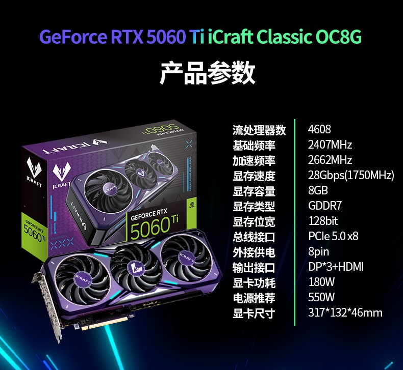 銘瑄 GeForce RTX 5060 Ti iCraft Classic OC8G 顯卡,搭載NVIDIA 全新 Blackwell 架構,配合 DLSS 4 多幀生成技術,實現了性能與畫質的雙重飛躍。數據顯示,相較 RTX 4060 Ti,其最高性能可提升2倍,讓《使命召喚:黑色行動7》的高畫質運行毫無壓力。顯存方面,顯卡配備 8GB GDDR7 高速顯存與 128bit 顯存位寬,能快速處理游戲中的高清紋理、爆炸特效等海量數據,避免畫面卡頓或掉幀。