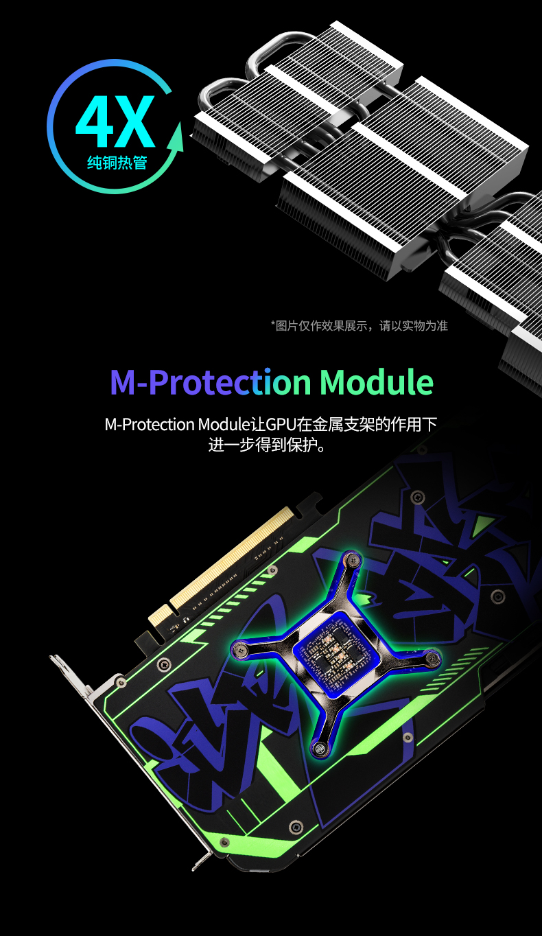 外觀上,這款顯卡潮味十足,打破了傳統顯卡棱角分明的刻板印象。電光紫 PC 導風罩與定制黯夜月光鍍層巧妙融合,呈現出陶瓷般圓潤細膩的質感,表面覆蓋的硬化層不僅讓顏值更持久,更賦予了膜片高硬度、耐磨、抗老化的實用屬性。流線型的設計理念讓顯卡整體更顯靈動,而高強度合金背板則暗藏巧思 —— 街頭涂鴉風格的涂裝大膽張揚,高飽和度的色彩與正面的黯夜月光鍍層形成鮮明呼應,個性化直接拉滿。更貼心的是,背板延續了 RGB 氛圍燈設計,還在尾部增加了散熱開孔,既讓燈光效果更具層次感,又能輔助散熱,做到 “顏值與實力并存”。