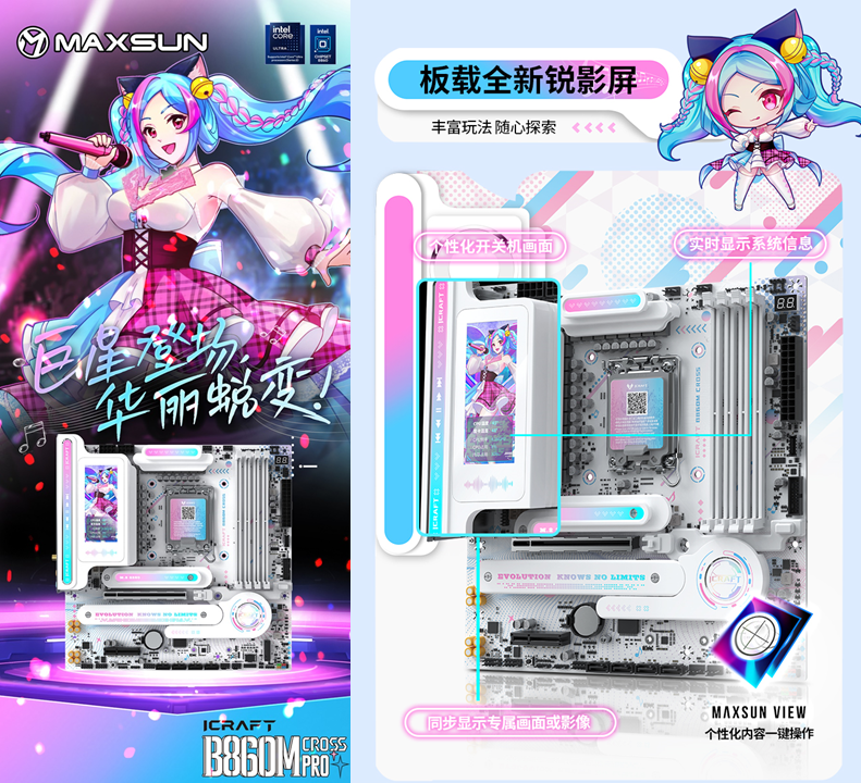 作為個性化白色主機的核心骨架,銘瑄iCraft B860M CROSS PRO璦珈主板,作為顏值旗艦,全覆蓋著藍粉漸變的二次元紋路,每一處細節都透著精致感。吸睛亮點莫過于全新配備的3.4英寸銳影LED顯示屏,不僅能實時顯示CPU溫度、內存頻率等系統信息,還能自定義開關機畫面,甚至支持桌面映射,同步展示專屬壁紙或游戲畫面。搭配配套軟件MAXSUN View,玩家可以盡情解鎖無限自定義玩法,讓主板成為主機的 “個性門面”。