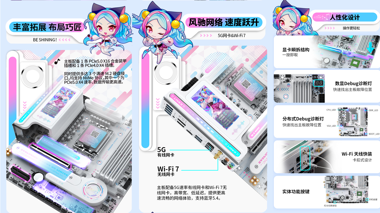 拓展性與網絡體驗更是直擊玩家需求。1條PCIe5.0 X16合金裝甲插槽+1條 PCIe4.0 X4 插槽,搭配3個滿速M.2硬盤接口和 4個6G SATA接口,無論是加裝高速固態硬盤還是拓展其他硬件,都能從容應對。多人對戰時就怕網絡卡頓,這款主板搭載英特爾BE200無線網卡,支持Wi-Fi 7 和藍牙5.4,再加上5G有線網口的雙旗艦網絡配置,傳輸速度又快又穩,讓你在《戰地6》的百人對戰中告別延遲,快速響應每一次戰術指令。更貼心的是,顯卡瞬拆結構和 Wi-Fi天線快裝設計讓裝機、升級更便捷,數顯+分布式 Debug 診斷燈能一眼識別故障位置,省去繁瑣排查步驟,讓玩家專注享受裝機與游戲的樂趣。