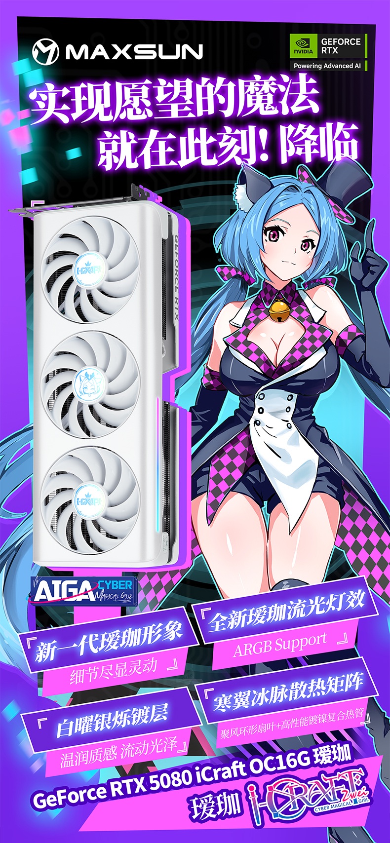 外觀上,銘瑄GeForce RTX 5080 iCraft OC16G璦珈這款顯卡與主板完美呼應,堪稱純白主機的 “顏值擔當”。采用全新白曜銀爍鍍層工藝,通過環保免噴涂注塑技術打造出珍珠白漸變閃銀效果,無需化學噴涂,就能呈現出隨光影變化的高級質感,機箱燈光每一次切換,都能帶來不一樣的視覺驚喜。溫潤細膩的白色基調適配各類主流機箱風格,更融入了璦珈系列的二次元基因:背板左側印著全新升級的 “魔術師” 璦珈形象,右側風扇鏤空區域則用線條勾勒出小巧 Q 萌的璦珈,細節處盡顯設計巧思,讓顯卡成為主機里的 “二次元寶藏”。
