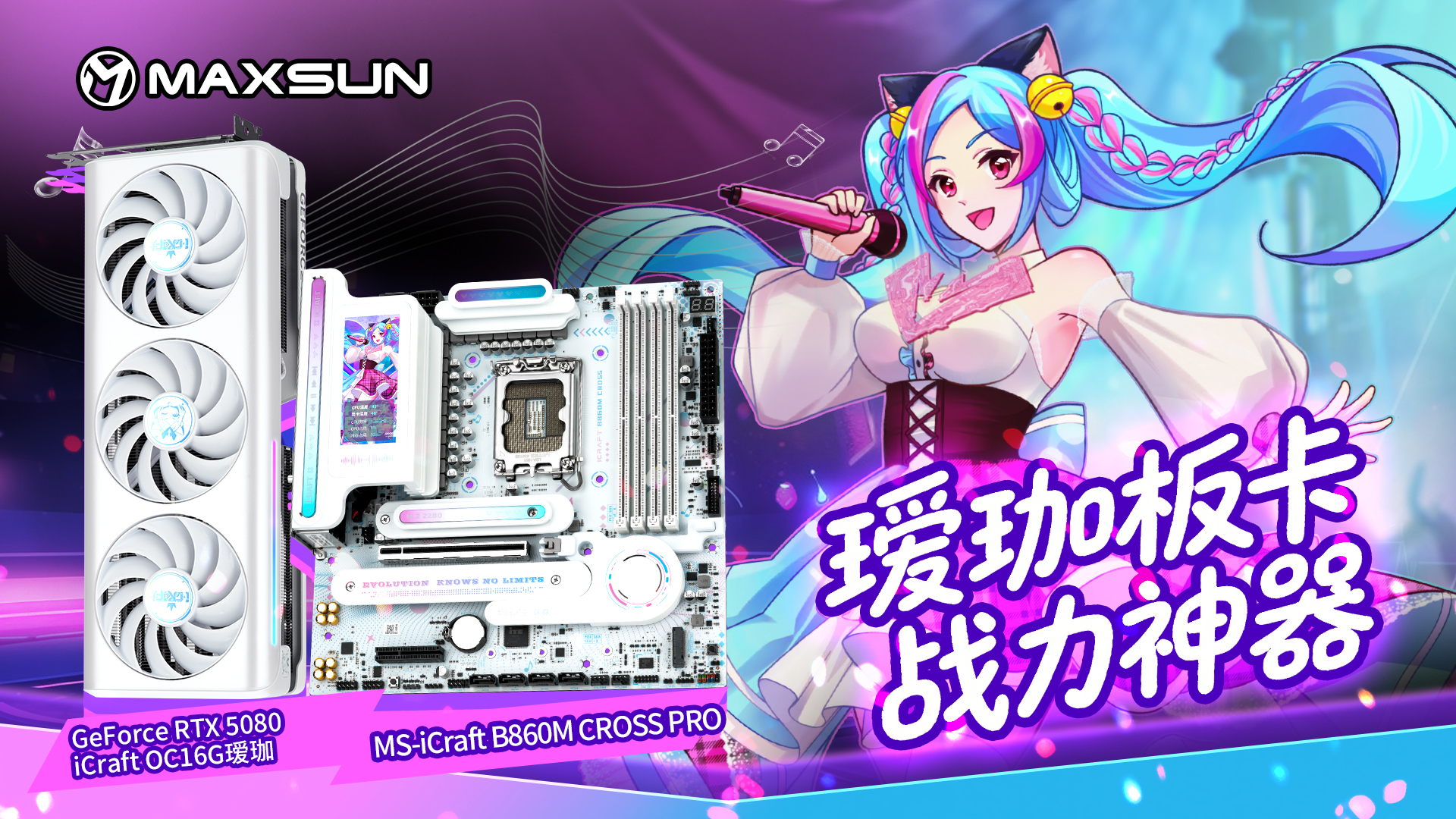 既想駕馭游戲的滿負載壓力,又想打造一臺顏值吸睛的個性化白色主機?對于追求性能與顏值雙重在線的硬核玩家來說,銘瑄 iCraft B860M CROSS PRO 璦珈主板搭配銘瑄 GeForce RTX 5080 iCraft OC16G 璦珈顯卡的黃金組合,就是不二之選。二次元純白設計戳中審美痛點,強悍性能適配各類3A游戲大作,從戰場戰力到裝機顏值,全程拉滿,陪你鏖戰每一場熱血對局。