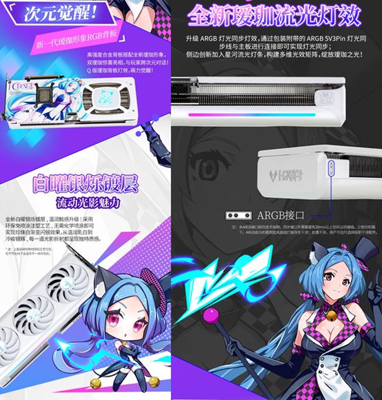 除了硬核的性能表現,這款顯卡的顏值同樣戳中玩家審美。外觀上延續溫潤質感的設計基調,升級ARGB燈光同步燈效,側邊創新加入星河流光燈條,燈光流轉間如同賽博世界的魔法光芒,靈動又吸睛。高強度合金背板不僅提供穩固防護,更搭載 Q 版璦珈燈效,萌力與科技感完美融合,讓顯卡靜置時也成為桌面一道亮眼風景。