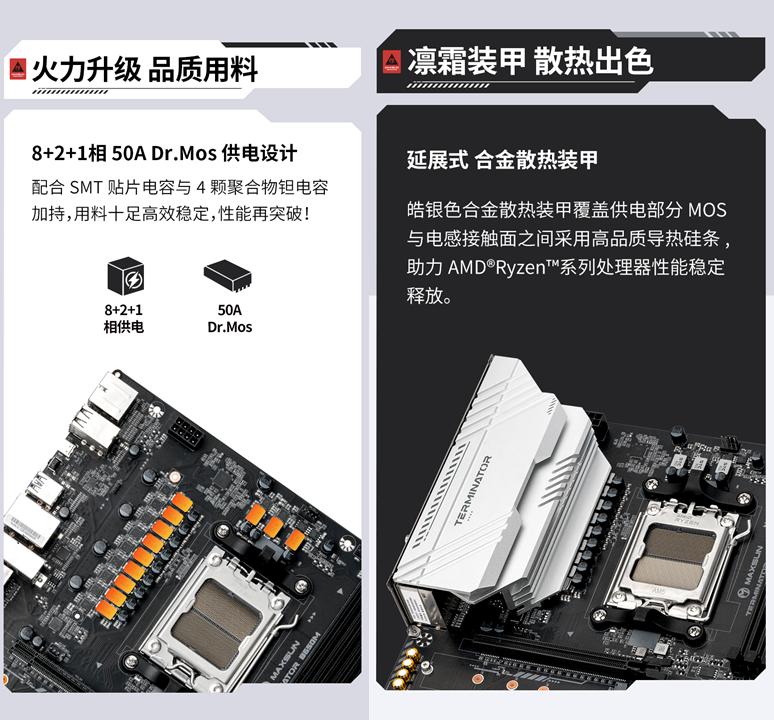 強悍性能的背后,是十足的用料。銘瑄Terminator B650M WIFI6主板采用8+2+1相 50A Dr.Mos 供電設計,配合高品質(zhì)的SMT貼片電容與聚合物鉭電容,能夠為AMD 銳龍?zhí)幚砥魈峁┓(wěn)定且強勁的電力支持。散熱方面更是誠意滿滿,皓銀色合金散熱裝甲覆蓋供電部分MOS與電感接觸面之間采用高品質(zhì)導熱硅條,如同給核心部件穿上 “降溫鎧甲”,助力AMD銳龍?zhí)幚砥餍阅芊(wěn)定,為用戶提供可靠的使用體驗。