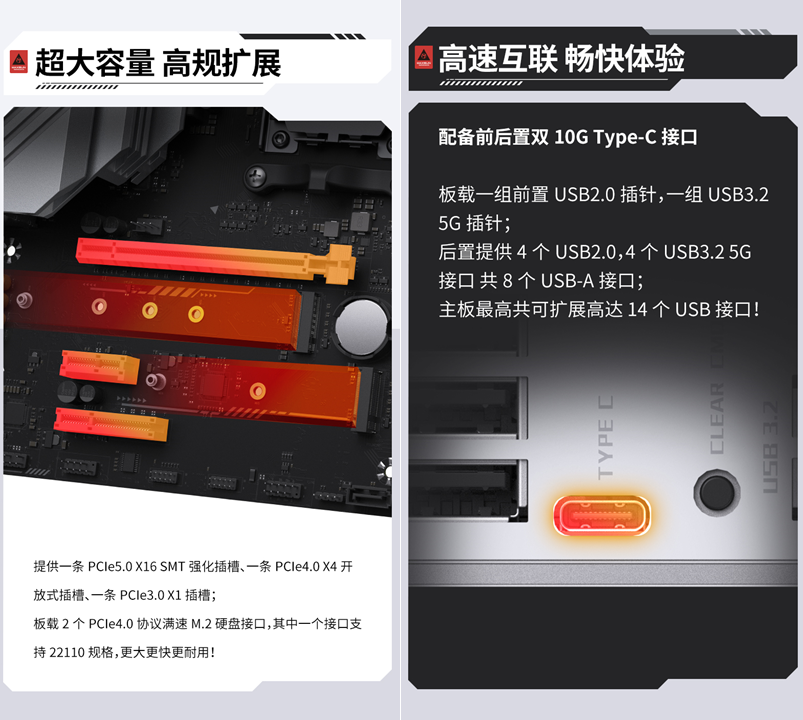 擴展能力方面,更是做到了 “全場景覆蓋”, 讓拓展需求無需妥協(xié)。該主板提供一條PCle5.0 X16 SMT強化插槽、一條PCle4.0 X4開放式插槽、一條PCle3.0X1插槽;板載2個PCle4.0協(xié)議滿速M.2硬盤接口,其中一個接口支持 22110 規(guī)格,更大更快更耐用。且接口十分豐富,擁有前后置雙10G 速率Type-C接口,可擴展高達14個USB接口,大大提高了擴展能力,無論是連接高速外設、多屏顯示還是充電需求,都能輕松應對,全板無沖突設計讓拓展更隨心所欲。