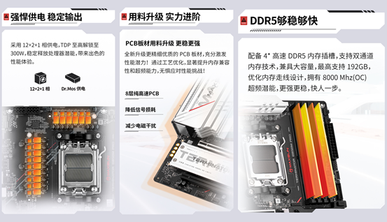 供電方面,該主板采用12+2+1相Dr.Mos供電設計,TDP至高解鎖至300W,即使是搭配AMD銳龍7 9800X3D這類高性能處理器,《三角洲行動》高強度對戰等超高負載游戲場景,提供持續且穩定的電力輸出,確保處理器性能完全釋放。讓你在激烈的槍戰對決中,避免因供電不穩導致的掉幀、卡頓,準確把握每一個轉瞬即逝的作戰時機,搶占對戰先機。