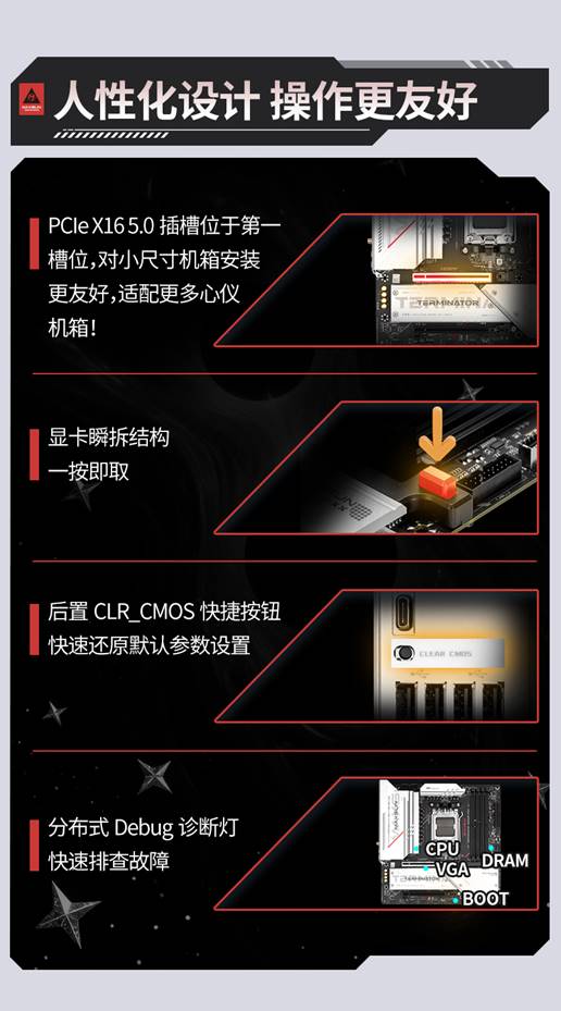 除了強悍的性能,銘瑄Terminator B850M PRO WIFI主板還加入了許多貼心設計,如顯卡瞬拆結構,裝機維護時無需費力拆卸螺絲;分布式Debug診斷燈能快速定位故障,小白也能輕松排查問題;CLR_CMOS快捷按鈕,讓設置重置更便捷,全程省心省力,裝機體驗直接拉滿。
