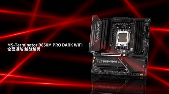 另外,銘瑄Terminator B850M PRO系列主板還推出了一款黑色版的銘瑄Terminator B850M PRO DARK WIFI。作為銘瑄終結者 PRO 系列的黑色款,這款主板將 “硬核美學” 貫徹到底,同樣的暗紅線條如機甲血脈般點綴,大面積的全金屬裝甲采用噴砂與拉絲工藝交織,打造出如同未來機甲般的冷峻質感,低調中透著霸氣。無論是搭配側透機箱展示內部硬件,讓每一處細節都成為視覺焦點;還是打造簡約風、電競風主機,這款黑色主板都能完美適配,輕松 hold 住各種裝機風格,滿足不同用戶的審美偏好。