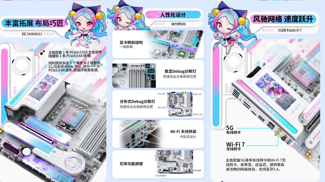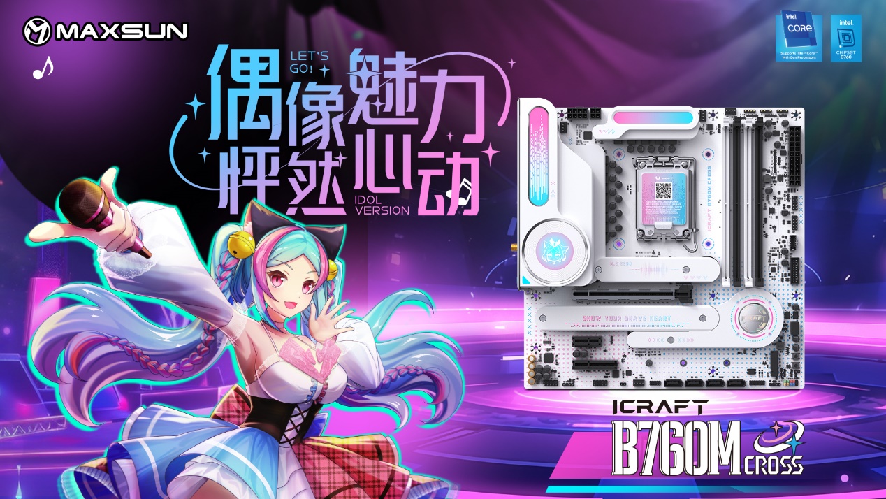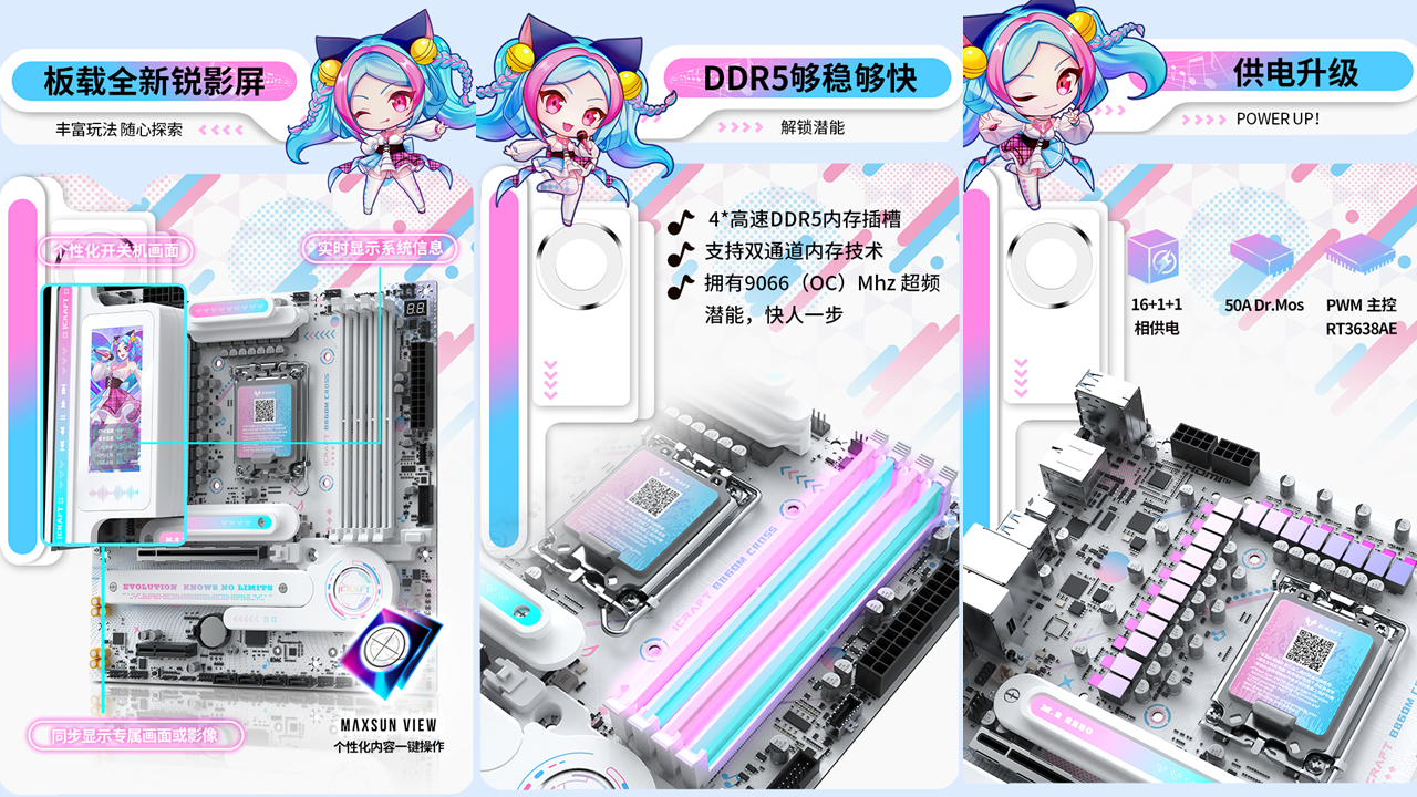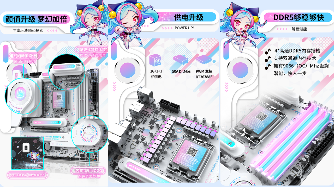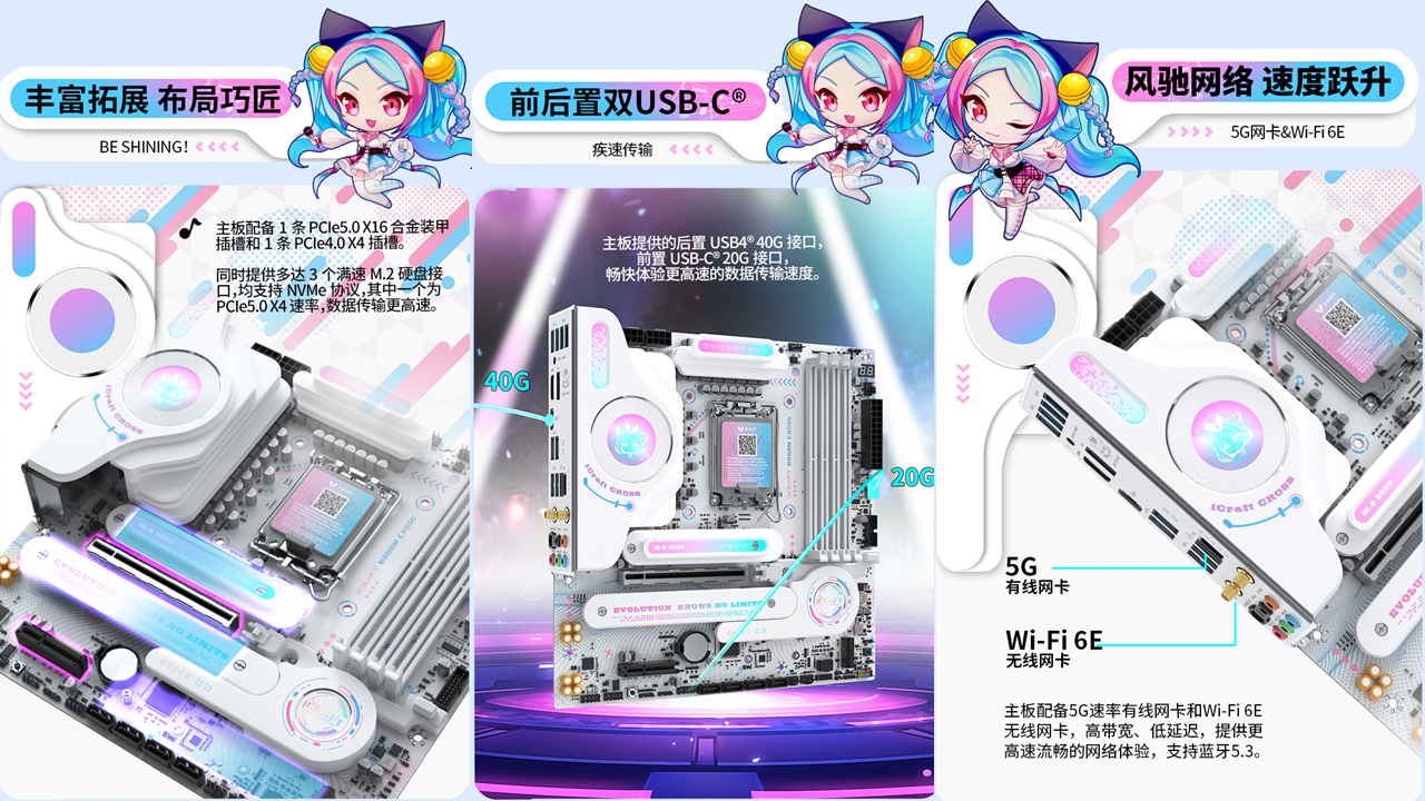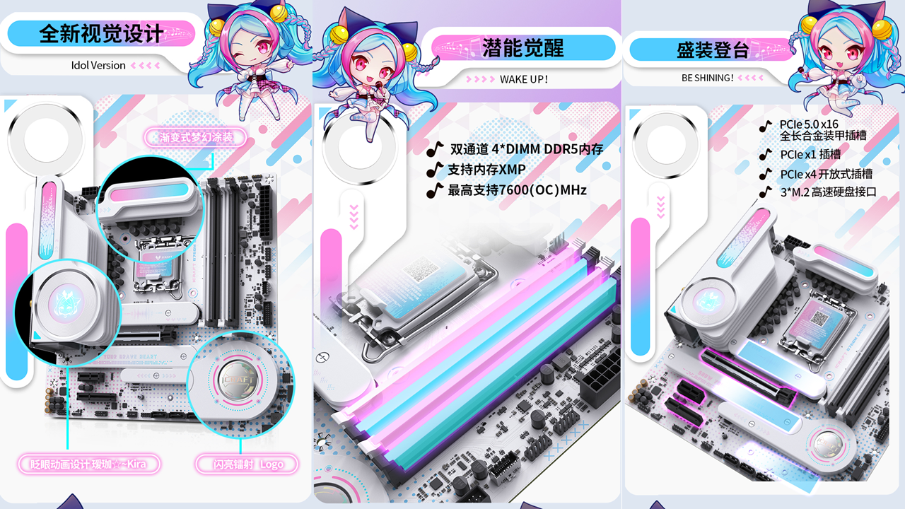 銘瑄iCraft B760M CROSS主板,外觀上粉藍配色,主板上的吉他裝甲以及多處的漸變設計點綴,加上全白的PCB和大面積的個性裝甲,吸睛度拉滿。值得一提的是主板上的創(chuàng)新式LED小屏幕,通電后可以發(fā)現(xiàn)這里是一個會眨眼的Q版璦珈,通過BIOS設置還能調(diào)節(jié)小璦珈的不同5種不同動作狀態(tài),給整個DIY主機注入了新的活力。除了出眾顏值,性能同樣不容小覷。供電方面,主板采用了12+1+1相的供電設計,核心供電都是50A Dr.Mos,備4條雙通道DIMM的DDR5內(nèi)存插槽,優(yōu)化的線路布局,讓它擁有優(yōu)秀的超頻能力,支持內(nèi)存XMP,最高可至7600MHz。還搭配了一條PCIE5.0 X16全長合金裝甲插槽、一條PCIex1 插槽、和一條PCIe x4開放式插槽,存儲方面主板搭載3個M.2硬盤接口、4個6G SATA接口,無論是外接設備還是擴容存儲,都能輕松滿足,適配宅家多樣化使用需求。