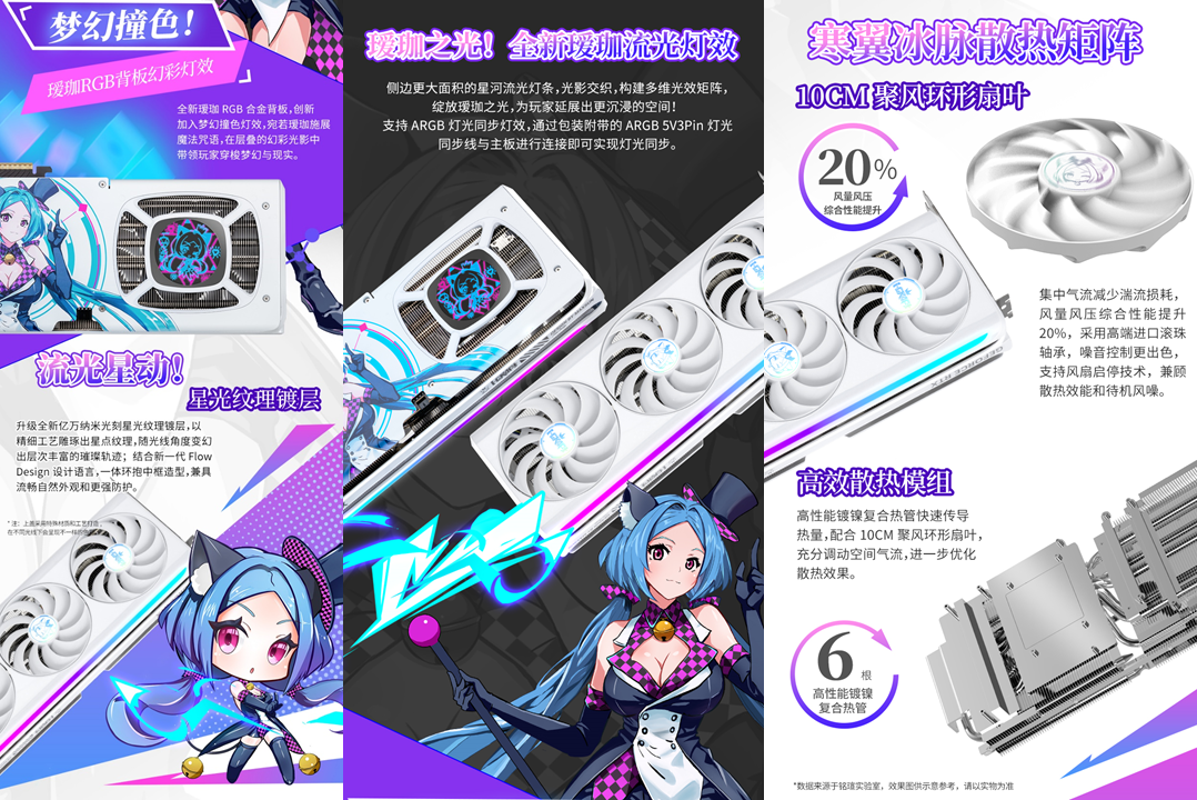 銘瑄GeForce RTX 5080 iCraft OC16G璦珈顯卡,升級 ARGB 燈光同步燈效,通過包裝附帶的ARGB 5V3Pin 燈光同步線與主板進行連接即可實現(xiàn)燈光同步;側(cè)邊創(chuàng)新加入星河流光燈條,構(gòu)建多維光效矩陣,綻放璦珈之光! 高強度合金背板搭配全新璦珈形象,雙璦珈驚喜亮相,與玩家跨次元對話!Q版璦珈背板燈效,萌力覺醒! 性能上,依托Blackwell 架構(gòu)滿血核心與 16GB GDDR7 顯存,運行《戰(zhàn)地 6》4K 高畫質(zhì)并開啟光線追蹤與 DLSS 4 超分辨率模式時,遠景植被、遠處建筑紋理清晰可見,夜間作戰(zhàn)時的手電筒光斑、爆炸火光等動態(tài)光影效果無拖影;支持 NVIDIA Reflex 低延遲技術,鼠標操作響應速度提升顯著,近距離剛槍時瞄準更準確,再也不會因延遲錯失爆頭機會,助你在跨年戰(zhàn)場中所向披靡。