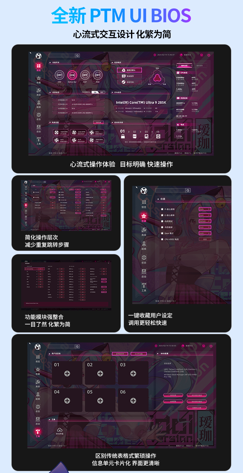 銘瑄iCraft B860M CROSS璦珈主板則為這份體驗提供了堅實支撐,采用新一代芯片組,相比 B760 主板性能進一步提升,全面支持銘瑄全新的PTM UI BIOS,操作更便捷。主板配備LED小屏幕,通電后會呈現(xiàn)活力滿滿的小璦珈眨眼動畫,魅力滿分!對比上一代,供電升級采用16+1+1相供電設計,核心供電50A Dr.Mos,輕松駕馭英特爾® 酷睿™ Ultra 9 處理器 285K;配備前后置雙USB-C®,后置USB4® 40G接口,支持最高40Gbps傳輸速率,數(shù)據(jù)傳輸更高速。并配備4條雙通道DIMM的DDR5內(nèi)存插槽,優(yōu)化線路布局,超頻能力更強,具備9066(OC)Mhz超頻潛能,盡情釋放偶像實力。